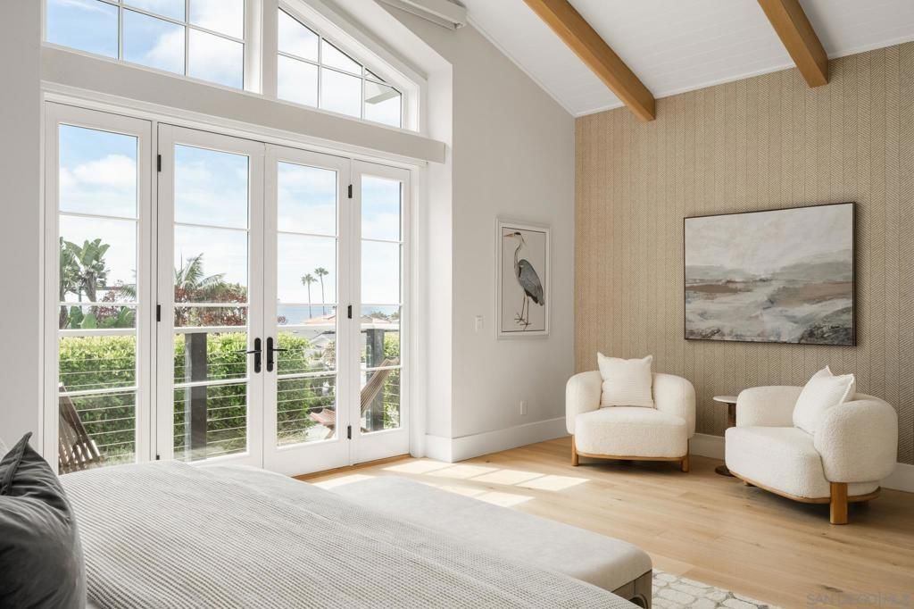 Set in Olde Del Mar just blocks from the beach, shops, and restaurants, this beautiful ocean-view home offers an exceptional coastal lifestyle. Built in 2022, the open 4-bedroom floor plan centers around an inviting great room with vaulted ceiling and retractable glass doors that open to an expansive porch, creating a seamless indoor-outdoor setting for sunset views. The chefs kitchen features a generously sized island with marble countertops and luxury Miele 6-burner range with grill and double ovens. Two bedrooms are located on the main level, including a luxurious primary suite with balcony and spa-like bath. On the lower level, thoughtfully designed light wells and high ceilings enhance the bright, airy feel of the two additional bedrooms and bonus room. A detached ADU, hot tub, built-in BBQ, and covered outdoor living area with fireplace create an ideal setting for entertaining. Complete with paid solar and a 2-car garage with EV charger, this stunning residence presents a rare opportunity to own a newer build in a highly sought-after location west of the 101.